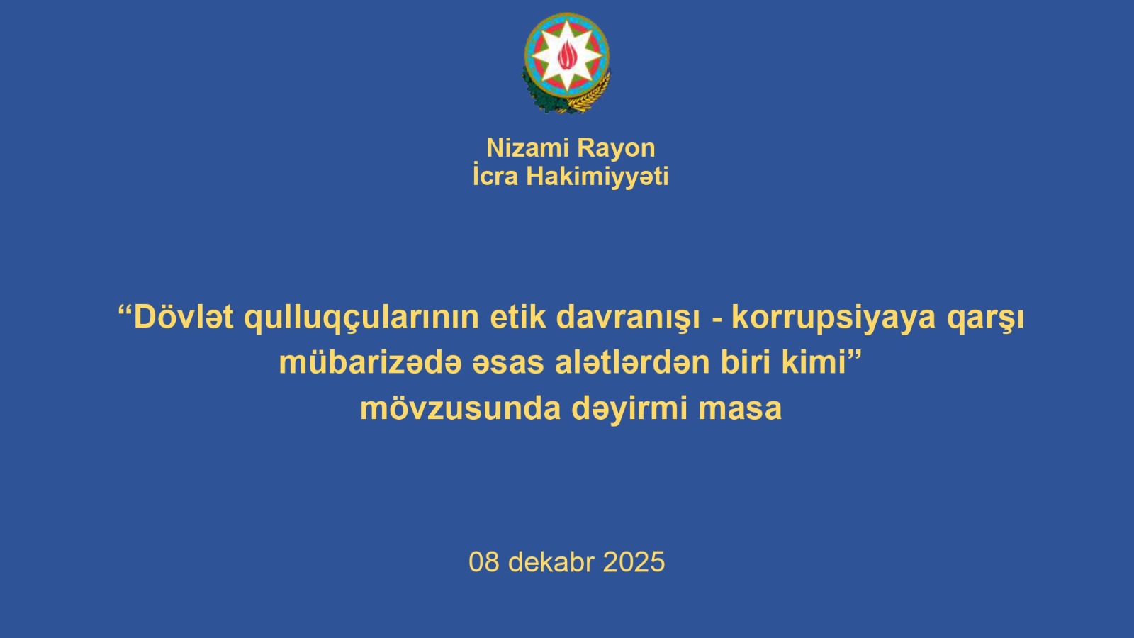 08 dekabr 2025-ci il tarixində Nizami Rayon İcra Hakimiyyətində "Dövlət qulluqçularının etik davranışı – korrupsiyaya qarşı mübarizədə əsas alətlərdən biri kimi" mövzusunda dəyirmi masa təşkil edilib.